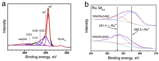 The analysis of the photoelectron spectra of the Ru3d5/2 level (Figure 5b) showed that ruthenium was predominantly oxidized on the surface of the 10Ni3RuS450 catalyst. This is evidenced by the binding energy of the Ru3d5/2 peak—281.3 ± 0.1 eV—which is typical for the Ru4+ state [23,24]. It should be noted that the range of binding energies for metallic ruthenium is 280.0–280.6 eV. Nevertheless, an analysis of the peak shape of the Ru3d5/2 line showed that an asymmetry was observed on the side of lower binding energies, which permitted the conclusion that ruthenium is present in the samples in the metallic state, as well. Using the Casa XPS program, the Ru3d5/2 peak was deconvoluted into separate spectral components (Figure 5b), describing metallic and oxidized ruthenium, and their ratio is presented in Table 3. The signal in the region of 280.5 ± 0.1 eV (Figure 5) showed that the main ruthenium state on the surface of the 10Ni3RuC400 catalyst was the metal [23,24].