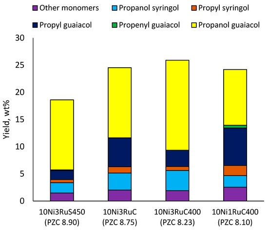 While going from monometallic Sibunit catalysts to the bimetallic one, the yields of the largest part of the monomeric products decreased, except for 4-propanol guaiacol and syringol, and they became the main products (15% of 18% total yield, Table 6). This may be connected with more monometallic catalysts’ acidity compared to bimetallic ones (pHPZC increased from 7.1 to 8.2). The lower acidity of the 10Ni3RuS450 prevents the acid-catalyzed dehydration of the alcohols, and they become the main products.