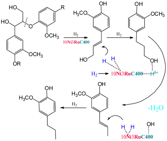The activity of NiRu, NiRh and NiPd catalysts exceeds that of single-component catalysts in the hydrogenolysis of lignin C–O bonds [18]. The NiRu catalyst contains 85% Ni and 15% Ru, composed of Ni surface-enriched and Ru–Ni atomically mixed, ultrasmall nanoparticles showing high activity under low temperature (100 °C) and a low H2 pressure (1 bar) in the β-O-4 type C–O bond hydrogenolysis of model compounds. The yield of monomers in the process of hydrogenation of the model compound on a bimetallic catalyst was 58% versus 36 and 8% on monometallic Ni and Ru, respectively [18].