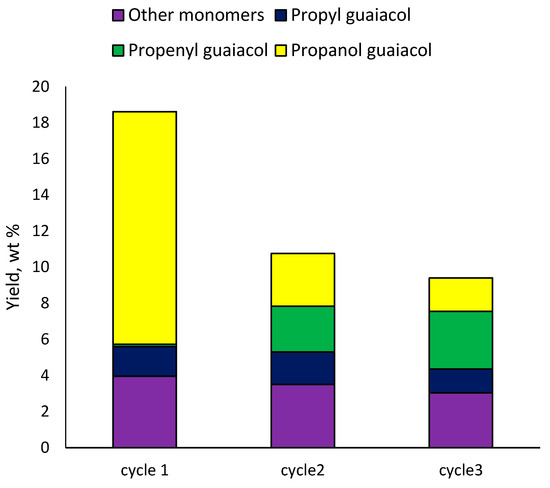 The 3Ru10NiS450 catalyst was separated from the solid residue using a magnet, followed by sifting through a sieve (cell 100 μm). The results of the catalyst recycling revealed that after the first cycle the monomer yield decreased from 18 to 11 wt% (Figure 8). In the second cycle, the decrease was less significant (down to 9 wt%). First of all, when the catalysts were recycled, their hydrogenating activity decreased, since the yield of 4-propenyl guaiacol increased from 0.1 to 2.5–3 wt%. At the same time, the content of 4-propanol guaiacol was significantly reduced; its yield did not exceed 3 wt%. Such results can be explained by the fact that the acidity of the catalyst was maintained, and the hydrogenation activity decreased. Data from Table 5 show that the ruthenium catalyst had greater hydrogenating and dehydrating activity compared to the nickel catalyst. Therefore, the activity of the ruthenium component was probably lost in the second and third cycle.
