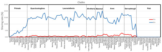 The sharing rates of human PALB2 PVs and BVs with other non-human species. The sharing rates of each species were calculated by the number of shared variants divided by the total number of PVs or BVs. X axis: 100 species in the eight clades (Primates, Euarchontoglires, Laurasiatheria, Afrotheria, Mammals, Aves, Sarcopterygii, and Fish); Y axis: the sharing rate. See Table S2A,B for details.