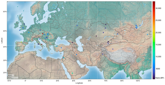 - Fu, Q.; Posth, C.; Hajdinjak, M.; Petr, M.; Mallick, S.; Fernandes, D.; Furtwängler, A.; Haak, W.; Meyer, M.; Mittnik, A.; et al. The genetic history of Ice Age Europe. Nature 2016, 534, 200–205. [Google Scholar] [CrossRef]
