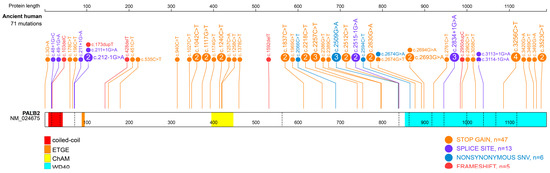 Through searching PubMed and Allen Ancient DNA Resource (version 54.1) [57], we collected the genomic sequences of 5231 ancient human samples information and genome sequences dated from 48,426 to 270 BP. The ancient human genome data were downloaded, and the human genome reference sequences containing PALB2 (chr16:23,603,165–23,641,310 in hg38 and chr16:23,614,486–23,652,631 in hg19) were used for mapping analysis. BWA algorithm was employed to map PALB2 sequences to human genome sequences [58]. The resulting SAM files were converted to BAM files and sorted using SAMtools [59]. Duplicates were removed using MarkDuplicates, and the BAM files were further processed with the GATK toolkit using default settings for quality control, filtration, and variant calling [60,61]. The called ancient PALB2 variants were annotated by ANNOVAR using default parameters to differentiate between known and novel variants and provide information about the variants [62]. The ancient human PALB2 variants were then compared with those from the ClinVar database, which represents the PALB2 variants in modern humans, to find the shared variants between modern and ancient humans. The estimated age and location of the ancient human fossils, which carried PALB2 variants, were extracted from the original publications. For the PALB2 PVs, the distribution and dated time for each variant were generated using MATLAB (The Math Works, Inc., Natick, MA, USA).