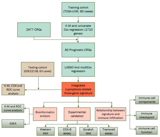 RNA sequencing data in the FPKM format and the clinicopathological characteristics of UVM (n = 80) were downloaded from the TCGA (http://portal.gdc.cancer.gov/, accessed on 31 July 2022), which was chosen as the training cohort. For the testing cohort, dataset GSE22138 and the clinicopathological data of UVM (n = 63) were downloaded from the GEO (http://www.ncbi.nlm.nih.gov/geo/, accessed on 31 July 2022). In addition, CRGs were identified from previous literature [8].
