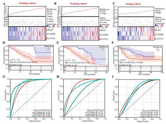 In this prognostic CRTG signature model, the risk score = 1.6560 × 10−6 × ACADSB + 6.7730 × 10−6 × ORAI2 + 1.8441 × 10−5 × SLC47A1, and using the median risk score as a cutoff point, the patients were divided into low-risk and high-risk groups. All the patients’ risk scores, survival outcomes, and three-gene expression levels are shown in Figure 3A–C, and we found that the patients with lower risk had better survival outcomes in both the training and testing cohorts. In addition, the K–M curves showed that the high-risk patients had poor OS and progression-free survival (PFS) in the training cohort and metastasis-free survival in the testing cohort (p < 0.01 all, Figure 3D–F).