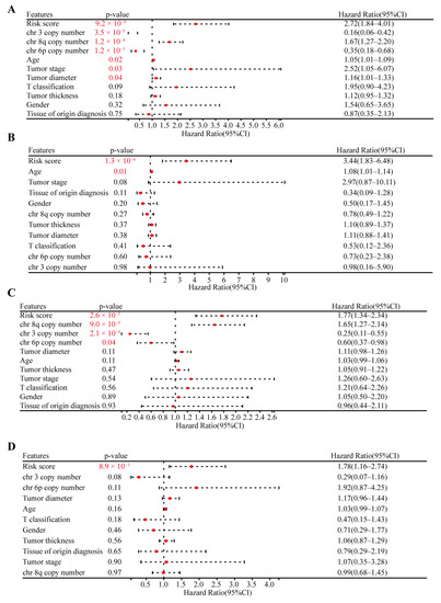 Finally, based on the OS and PFS data, we used both univariate and multivariate Cox regression to validate the prognostic capacity and independence of the CRTG signature with other clinical characteristics, including age, sex, tumor stage, tumor T classification, tissue of origin diagnosis, tumor thickness, tumor diameter, and the copy number of chromosomes 3/6p/8q. As shown in Figure 4A,B, the risk score of the CRTG signature and age were the risk factors for OS (risk score: hazard ratio (HR) = 2.72, p = 9.2 × 10−9; HR = 3.44, p = 1.3 × 10−4). In addition, in Figure 4C,D, the risk score was the only risk factor for PFS in the TCGA-UVM patients (HR = 1.77, p = 2.6 × 10−5; HR = 1.78, p = 8.9 × 10−3). In conclusion, the CRTG signature was an independent prognostic variable.