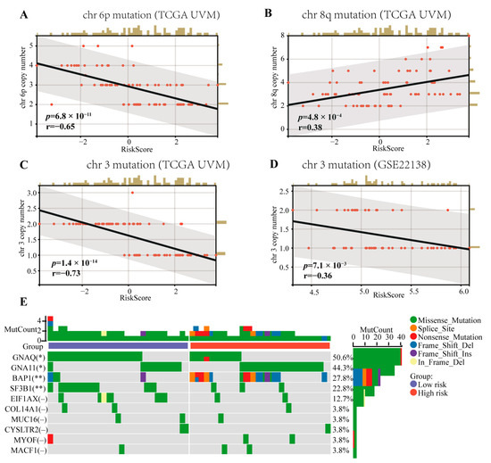 Correlations between the CRTG signature risk score and the chromosome aberrations of UVM and the mutation landscape of the CRTG signature. (A,B) The risk score of the CRTG signature was negative with the chr 6p copy number and positive with the chr 8q copy number in the training cohort. (C,D) The risk score of the CRTG signature was negative with the chr 3 copy number in both the training and testing cohorts. (E) Mutation landscape of the CRTG signature: the top 10 most frequently mutated genes in all the patients from the TVGA-UVM dataset. The black line in each graph fits a linear model that indicates the proportional trend of the chromosome aberrations and the risk score. The grey shading around the black line indicates the 95% confidence interval. The brown columns and red dots represent UM cases. The en dash indicates no statistical significance. * p < 0.05 and ** p < 0.01.