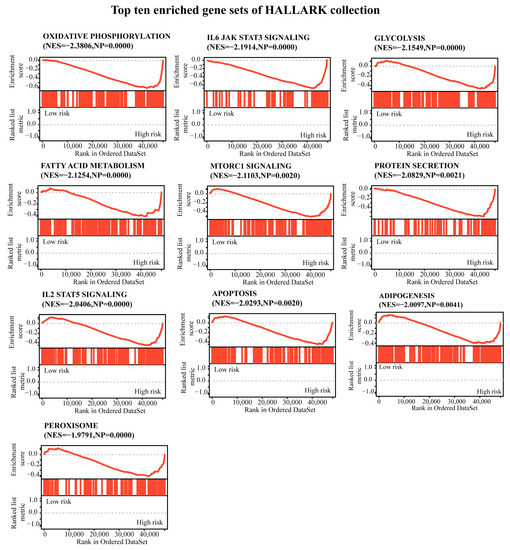 A gene set enrichment analysis (GSEA) was conducted between the low-risk and high-risk groups, as shown in Figure 6 and Table S2, and the enriched gene sets in the high-risk group were mainly involved in mechanisms related to oxidative phosphorylation, IL-6 jak stat3 signaling, glycolysis, fatty acid metabolism, mtorc1 signaling, protein secretion, IL-2 stat5 signaling, apoptosis, adipogenesis, and peroxisome.
