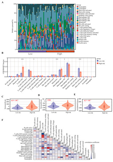 Comparison of the 22 TICs between the low-risk and high-risk groups. (A) Heatmap of the 22 TICs in all the patients. (B) Comparing the proportions of the 22 TICs between the low-risk and high-risk groups. (C–E) Comparison of the immune, stromal, and estimate scores. (F) Heatmap of the correlation of the immune cells. * p < 0.05, ** p < 0.01, and *** p < 0.001.