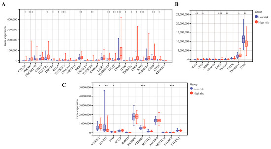 The differential gene expression of the immunotherapy checkpoints (A,B) and m6A (C) between the low-risk and high-risk groups. * p < 0.05, ** p < 0.01, and *** p < 0.001.