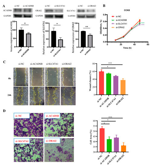 To verify the prognostic function of the CRTG signature further, we used the MUM-2B cell line. The transfection efficiency was confirmed via Western blotting (Figure 10A), as the expressions of ACADSB, SLC47A1, and ORAI2 were dramatically reduced by siRNA. We found that the downregulation of ACADSB and SLC47A1 significantly inhibited the proliferation of MUM-2B cells, although the downregulation of ORAI2 had no significant inhibitory effect (Figure 10B). Furthermore, the scratch test showed that the scratches healed slowly after SLC47A1 and ORAI2 knockdown, suggesting that SLC47A1 and ORAI2 knockdown reduced the migration ability of MUM-2B cells (Figure 10C). Moreover, the migration ability was assessed via transwell assay, and the results showed that knockdown of ACADSB, SLC47A1, and ORAI2 reduced the migration ability of MUM-2B cells (Figure 10D). In conclusion, these findings indicate that ACADSB, SLC47A1, and ORAI2 are risk factors in MUM-2B cells and that their high expression promotes UVM cancer growth in some way.