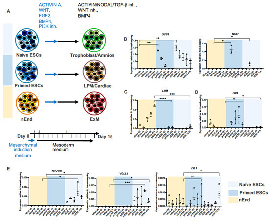 To assess if ExM can be derived from nEnd, we applied the above-mentioned mesoderm induction protocol on nEnd cells and analyzed the gene expression profiles on day 0, 1, 2, 8, and 15 by RT-qPCR. We also subjected naïve ESCs (nESC) and primed ESCs (prESC), representing pre- and post-implantation embryonic epiblast cells, respectively [45], to the same mesoderm induction protocol (Figure 2A). As expected, nEnd cultures showed no OCT4 expression, a marker for the embryonic pluripotency (Figure 2B) [28,46,47]. Importantly, the PS marker TBXT was not expressed in nEnd cultures at any time point, whereas it peaked in prESC cultures on day 1, corresponding to the PS state. A weaker TBXT peak was detected in day 1 nESC cultures, suggesting that the nESC cultures contained a small fraction of cells that can directly differentiate towards PS (Figure 2B). Notably, LUM expression was significantly increased on day 15 in nEnd cultures compared to prESC and nESC, indicating that nEnd cells have a higher ExM conversion efficiency (Figure 2C). The negative marker LIX1 exhibited low expression levels in all conditions on day 15 (Figure 2D). Furthermore, late-stage nESC cultures showed enrichment of the amnion marker TFAP2B [48] as well as the trophoblast marker VGLL1 (Figure 2E) [49]. Here, ISL1, also associated with amnion [50], exhibited an increasing expression trend (Figure 2E).