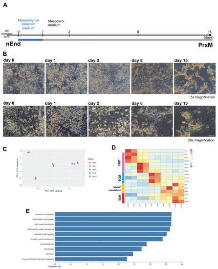 Mesoderm induction protocol converts nEnd cells into PrE-derived ExM (PrxM). (A) Schematic illustration of the sequential protocol used to differentiate nEnd into ExM-like cells termed PrxM. Cells are initially subjected to mesenchymal induction (blue) followed by 14 days of mesoderm differentiation (grey). (B) Representative brightfield images of nEnd differentiating towards PrxM, taken at different time points 5× magnification, scale bar: 500 μm; 20× magnification, scale bar: 100 μm. (C) PCA plot of bulk RNAseq results from different time points. While day 1 represents a unique EMT and cell delamination stage, day 8 and 15 cells have similar profiles. (D) Heatmap displaying relative expression levels of selected differentially regulated genes at different time points, showing upregulation of the ExM markers LUM, ANXA1, and PARM1 along the differentiation trajectory. Pink, EMT; blue, ECM; yellow, blood and vasculature; red, ExM. (E) GO term enrichment analysis of genes differentially expressed in PrxM compared to nEnd indicates a significant overrepresentation of terms associated with vasculogenesis and cell migration.
