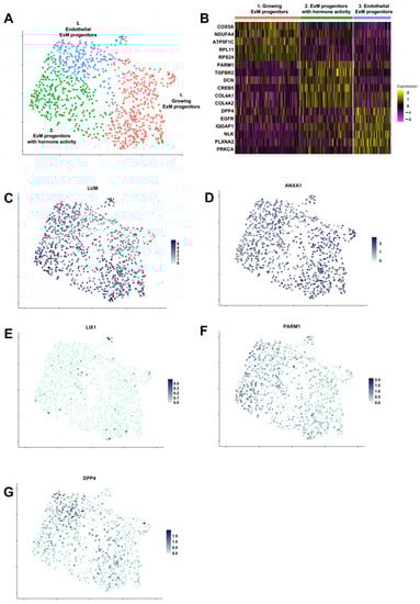 To gain insight into the composition of the PrxM cell population, scRNAseq was performed using the 10x technology from cryopreserved cells. A total of 944 cells that passed the quality control were used for further analysis. Uniform Manifold Approximation and Projection (UMAP) clustering revealed a predominantly homogeneous cell population that could be divided into three subclusters with distinct gene expression profiles (Figure 4A,B). The key ExM markers LUM and ANXA1 were highly and largely homogeneously expressed in all subclusters, and the negative marker LIX1 levels were generally low (Figure 4C–E). The putative ExM marker PARM1 found by bulk RNAseq was also expressed in all subclusters with an enrichment in subcluster 2 (padj = 2.66 × 10−13) (Figure 4F). On the contrary, another presumed ExM marker found by bulk RNAseq, DPP4, was increased in subcluster 3 (padj = 4.97 × 10−11) (Figure 4G).