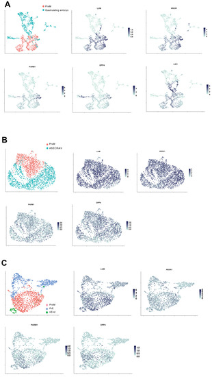 - Pijuan-Sala, B.; Griffiths, J.A.; Guibentif, C.; Hiscock, T.W.; Jawaid, W.; Calero-Nieto, F.J.; Mulas, C.; Ibarra-Soria, X.; Tyser, R.C.V.; Ho, D.L.L.; et al. A single-cell molecular map of mouse gastrulation and early organogenesis. Nature 2019, 566, 490–495. [Google Scholar] [CrossRef]