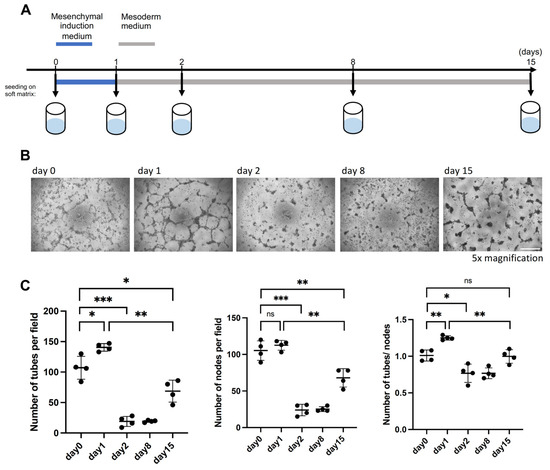 To determine whether the increased expression of angiogenesis-associated genes and the resemblance to in vivo ExM population confer functional properties to PrxM, we evaluated the angiogenesis potential of nEnd cells undergoing differentiation towards an ExM-like state on days 0, 1, 2, 8, and 15 (Figure 6A). We employed the tube formation assay, which is widely used to determine either the vessel formation capacity of cells or (anti-)angiogenic effects of compounds in the media [82,83]. Since the basal medium used in this study, N2B27, contains the pro-angiogenic factor insulin [84,85], we seeded cells at the above-mentioned time points on growth factor-reduced soft matrix and in basal N2B27 medium and incubated them for 1 day (Figure 6A,B). The number of tubes, nodes, and the tube/node ratio were quantified to characterize the vascularization pattern. Already on day 0, nEnd cells exhibited vascularization potential, which increased on day 1 but drastically decreased on day 2. Subsequently, the vasculogenesis activity remained relatively low until day 8, but unexpectedly, it showed a partial restoration on day 15 (Figure 6C), despite the similar gene expression patterns observed between day 8 and day 15.