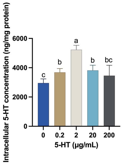 Compared with the control group, the intracellular 5-HT concentrations were increased in cells treated with 0.2, 2, or 20 μg/mL of 5-HT for 24 h (p < 0.05, Figure 1). The cells treated with 2 μg/mL of 5-HT exhibited the greatest intracellular 5-HT concentration compared with other groups. There was no significant difference in intracellular 5-HT concentration between the control group and cells treated with 200 μg/mL of 5-HT (p > 0.05).