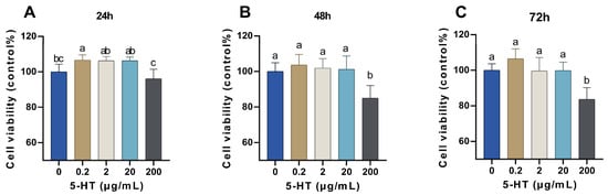 Effects of 5-HT on MAC-T cell activity. (A–C) MAC-T cells were treated with the indicated concentrations of 5-HT (0, 0.2, 2, 20, or 200 μg/mL) for the indicated times (24, 48, or 72 h). The values represent the mean ± SEM (n = 6). The variant letter indicates a significant difference when p < 0.05.