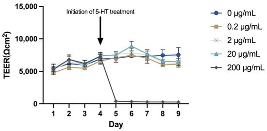 Effects of 5-HT on transepithelial electrical resistance (TEER) in MAC-T cells (Ωcm2). The values represent the mean ± SEM (n = 6). The arrow indicates the time-point when indicated concentrations of 5-HT (0, 0.2, 2, 20, or 200 μg/mL) was added.