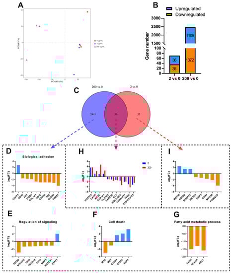 Among the thirty six shared DEGs observed both in the “200 vs. 0” and “2 vs. 0”, seven down-regulated DEGs (CLSTN2, FAM83C, NYX, BOLA-DRA, C6H4orf17, TFEC, and C19H17orf78) and four up-regulated DEGs (HOXA13, CATIP, KIF5C, and CYP1A1) were observed (Figure 4H). As shown in Figure 4I, five down-regulated DEGs (METRN, DZIP3, CDH4, MYO3B, and FAM221B) and three up-regulated DEGs (MEIOB, HSPB2, and S100A12) were observed in “2 vs. 0”.