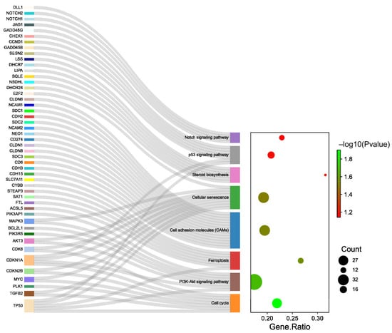 The results of GO enrichment analysis for “200 vs. 0” comparison showed that eight specific pathways related to mammary gland involution were enriched, including the Notch signaling pathway (DLL1, NOTCH2, NOTCH1, and JAG1, Figure 5), p53 signaling pathway (GADD45G, CHEK1, CCND1, GADD45B, SESN2, CDKN1A, and TP53), steroid biosynthesis (LSS, DHCR7, LIPA, SQLE, NSDHL, and DHCR24), cellular senescence (E2F2, MAPK3, AKT3, CDK6, CDKN1A, CDKN2B, MYC, TGFB2, and TP53), cell adhesion molecules (CLDN-6, NCAM1, SDC1, CDH2, SDC2, NCAM2, NEO1, CD274, CLDN-1, CLDN-8, SDC3, CD6, CDH3, and CDH15), ferroptosis (SLC7A11, CYBB, STEAP3, SAT1, FTL, ACSL5, and TP53), PI3K-Akt signaling pathway (PIK3AP1, MAPK3, BCL2L1, PIK3R5, AKT3, CDKN1A, and TP53), and cell cycle (CDK6, CDKN1A, CDKN2B, MYC, PLK1, TGFB2, and TP53).