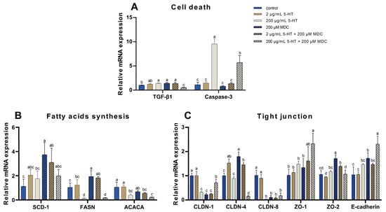 Effects of 5-HT (0, 2, or 200 μg/mL) and 200 μM monodansylcadaverine (MDC) on the mRNA expressions of selected genes. (A) RT-PCR analyses of the relative mRNA expression of genes associated with cell death. (B) RT-PCR analyses of mRNA expression of genes associated with fatty acids synthesis. (C) RT-PCR analyses of mRNA expression of genes associated with tight junction. The values represent the mean ± SEM (n = 6). The variant letter in the same bar chart indicates a significant difference when p < 0.05.