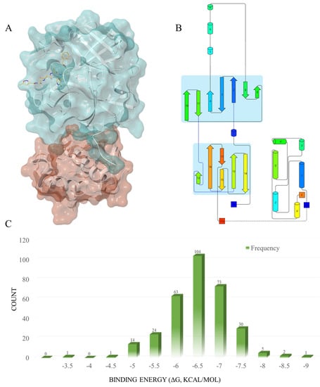 (A) The three-dimensional spatial structure of the main protease; Domain 1 (blue) and Domain 2 (red), with the native ligand N3 (yellow). (B) The secondary structure of the main protease. This figure was produced using the Pro-origami website (http://munk.cis.unimelb.edu.au/pro-origami/porun.shtml, accessed on 30 June 2016). The barrels represent α-helices; the arrows represent β-sheets. (C) The frequency distribution of the compound docking scores, based on the SP docking results.