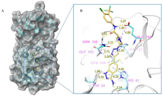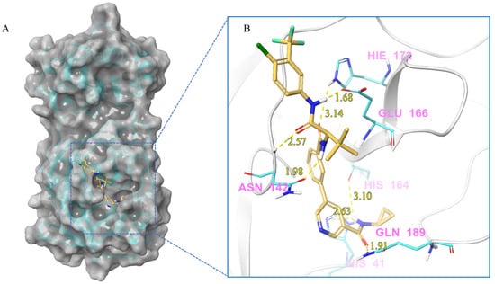 (A) The complex of the compound V291 binding with Mpro. (B) The interaction between the compound V291 and the Mpro residues.