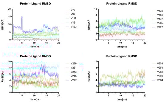 Molecular dynamics analysis of 20 ligand-receptor complexes. The RMSD value reflects the stability of a ligand-receptor complex.