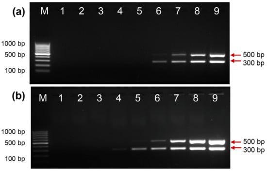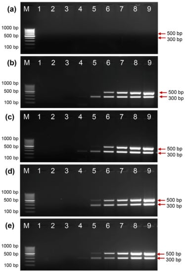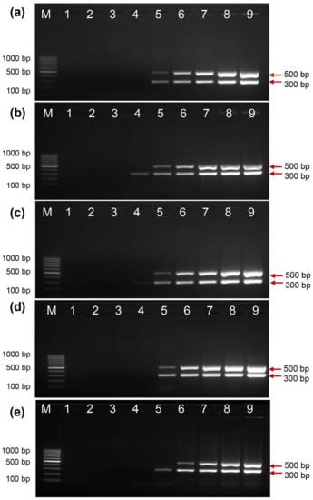- Ailenberg, M.; Silverman, M. Controlled Hot Start and Improved Specificity in Carrying Out PCR Utilizing Touch-Up and Loop Incorporated Primers (TULIPS). Biotechniques 2000, 29, 1018–1024. [Google Scholar] [CrossRef] [PubMed]