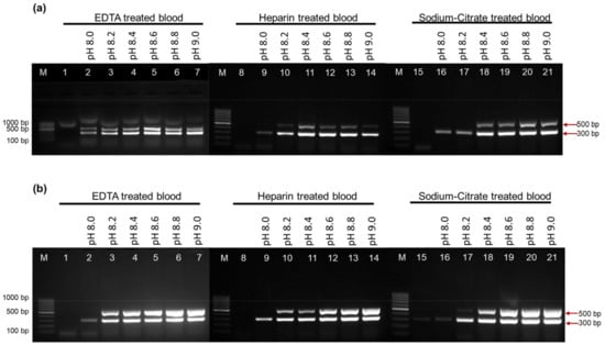 - Bu, Y.; Huang, H.; Zhou, G. Direct Polymerase Chain Reaction (PCR) from Human Whole Blood and Filter-Paper-Dried Blood by Using a PCR Buffer with a Higher PH. Anal. Biochem. 2008, 375, 370–372. [Google Scholar] [CrossRef] [PubMed]