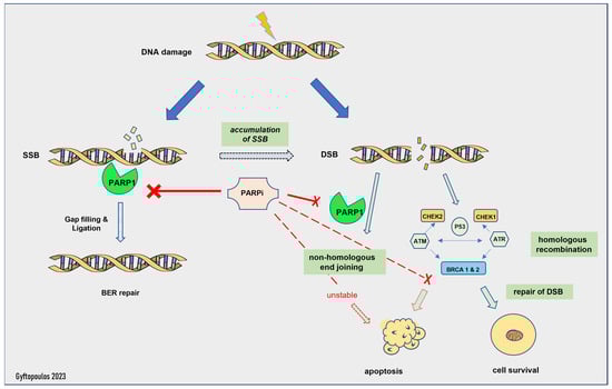 Mechanism of action of PARP inhibitors. SSB: single-strand break, DSB: double-strand break, BER: base excision repair.