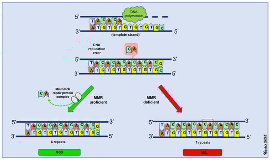 A deficient MMR system, due to mutations or epigenetic modifications, results in a propensity for multiple point mutations across the genome (hypermutability), thereby inactivating tumor suppressor genes and driving tumor initiation and progression [91]. Tumors that develop through the dMMR pathway have a high mutational burden and are also characterized by alterations in the lengths of microsatellites; hence, this pathway is termed microsatellite instability [96]. Microsatellites are repetitive sequences consisting of one to eight nucleotides and are more commonly located near the coding regions of various genes [95,96]. DNA polymerase slippage during DNA replication causes alterations in their lengths through the insertion or deletion of base pairs [105,106,107]. The MMR system is responsible for correcting these types of errors. Thus, the functionality of the MMR system defines the microsatellite status (MS) of the tumor. If the MMR system is working properly (MMR-proficient or pMMR), the tumor is microsatellite stable (MSS) or it has low microsatellite instability (MSI-low) [95]. If there is a deficiency in the MMR system (dMMR), then the tumor (MSI-high) has high microsatellite instability (Figure 2).