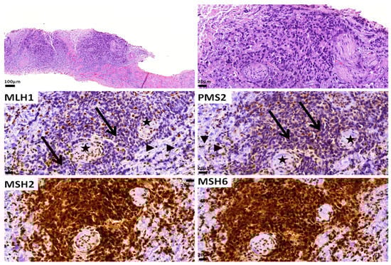 The MMR status can be detected by assessing the expression of the relevant proteins by immunohistochemistry [95]. When neoplastic cells retain the expression of all the proteins, then the tumor is considered MMR-proficient (pMMR), and the enzymes of mismatch repair are considered functionable. dMMR is defined by the loss of expression of one or more of the four MMR proteins (MLH1, MSH2, MSH6 and PMS2) [96]. As these proteins function as heterodimers, PMS2 and MSH6 are usually unstable without their respective partners, i.e., MLH1 and MSH2. Thus, when MLH1 is lost (due to mutation or hypermethylation of the MLH1 gene), PMS2 (its dimer partner) is also not expressed in the tissue. Similarly, when MSH2 is lost (due to mutation of its gene), MSH6 expression is also lost (Figure 3). In contrast, MLH1 and MSH2 are stable even when PMS2 and MSH6 are absent. Therefore, in the case of the loss of PMS2 or MSH6 (due to mutations of their respective genes), the expression of their partners, MLH1 and MSH2, respectively, is retained in the tissue [141,144].