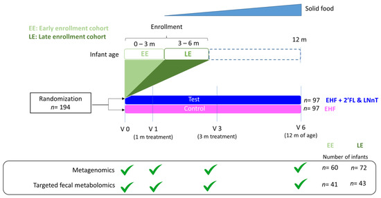Description of study design: One hundred ninety-four infants were randomized to a test group fed EHF supplemented with 2′-FL and LnNT and a control group fed the same EHF without HMO. Due to the large age heterogeneity at enrollment (see Supplementary Figure S1), the population was divided into an early enrollment (EE: aged 0 to 3 months) and a late enrollment cohort (LE: aged 3 to 6 months). Fecal samples were collected at 1 month (V1) and 3 months from the start of the study formulas (V3), as well as at 12 months of age (V6). If sufficient sample volume was available, metagenomics and targeted metabolomics analysis were performed. In total, samples from 132 infants (EE: n = 60; LE: n = 72) were available for metagenomic analysis, and 84 samples for fecal metabolomics (EE: n = 41; LE: n = 43), respectively. More details about sample numbers in the control and test groups at baseline (V0), visit 1 (V1), visit 3 (V3), and visit 6 (V6) are available in Supplementary Figure S2.