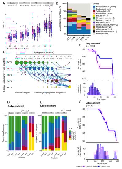 Comparison of microbiota compositions and trajectories between feeding groups (test vs. control), stratified by early enrollment (0–3 months of age; EE) and late enrollment (3–6 months of age; LE). (A) Alpha diversity (Faith’s phylogenetic diversity [PD]) of the gut microbiomes of the infants in the two feeding groups at each timepoint (V0, V1, V3, V6) stratified for the EE and LE cohorts. Box plots show the median, 25th and 75th percentiles with Tukey whiskers. At each time point, the two treatment groups were compared, stratified by EE and LE, using a two-sided Mann–Whitney U test. Nominal p values are indicated above the groups. (B) Taxonomical overview of the 5 fecal community types (FCT) at the genus level. Bar plots display the mean abundance within each FCT of the 10 most abundant taxa; the remainder are grouped in “Other.” (C) The transition model analysis depicts the temporal progression from early to late FCT clusters based on all 481 samples. Node sizes represent the fraction of infants in a given cluster per age group (column). Line widths represent the fraction of transitions per age group (column). The line color indicates the transition category (grey: no change, blue: progression, red: regression). In analogy to the methodology used by Stewart et al., only transitions with frequencies >4% are shown [2]. (D,E) Distribution of FCTs per feeding group in the EE (D) and LE cohort (E). For each time point, the proportion of samples assigned to each of the five FCTs is shown, stratified by treatment group and enrollment cohort. (F,G) Kaplan–Meier plot illustrating the transitioning to FCT3 (or later FCT, i.e., FCT4 or FCT5) as a function of age for the EE cohort (F) and LE cohort (G). Time of event is defined as the age at the earliest visit where the infant is observed to have the FCT3 or later FCTs. The two treatment groups were compared using the log-rank test, and nominal p values are indicated above each plot. Vertical lines indicate censored data. The seven infants with only a V6 sample are excluded. The bottom panel shows the number of samples for a given age (bin width = 15 days) and illustrates the uneven age distribution. NB: The LE cohort has no observations during the first 90 days. A cross on the survival line is marked when data are no longer available for a given infant beyond that time point.