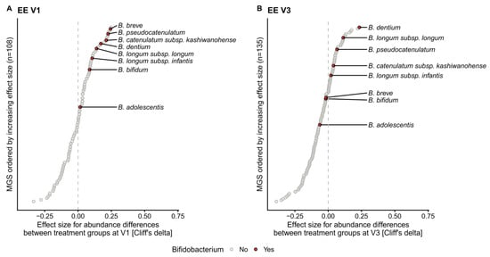 Bifidobacterium species enrichment in the test group at V1 and V3 in the EE cohort. Each circle indicates the effect size (Cliff’s delta) of a single metagenomic species (MGS) in comparison to the relative abundance between the control and HMO-treated infants at (A) V1 and (B) V3. The included MGS (y-axis) are sorted by their corresponding Cliff’s delta (x-axis). The following numbers of samples were included at V1: EE control, n = 27; EE test, n = 32; and at V3: EE control, n = 25; EE test, n = 33.