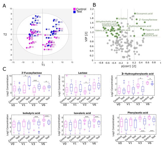 HMO supplementation impacts the fecal metabolic profile in the EE cohort. (A) PLS regression score plot modeling age on the first component and feeding groups on the second component at V3 and V6. (B) Volcano plot showing cumulative VIP score and correlation coefficient to treatment (PC2). Each dot corresponds to a metabolite. Most discriminating metabolites (VIP > 1 & |PLS coefficient (p(corr))| > 0.2) to feeding groups are highlighted in green. (C) log2 scaled concentration (nmol/g) of 2′-FL, lactose, 3-hydroxyphenylacetic acid, phenylacetic acid, isobutyric acid, and isovaleric acid in the control (highlighted by pink box plots) and test group (highlighted by blue box plots) at each visit. The cross symbols show the outliers that are 1.5 times the interquartile range away from the bottom or top of the box. Significant differences between treatment groups were calculated using the Wilcoxon–Mann–Whitney test (p-value * <0.05, *** <0.001).