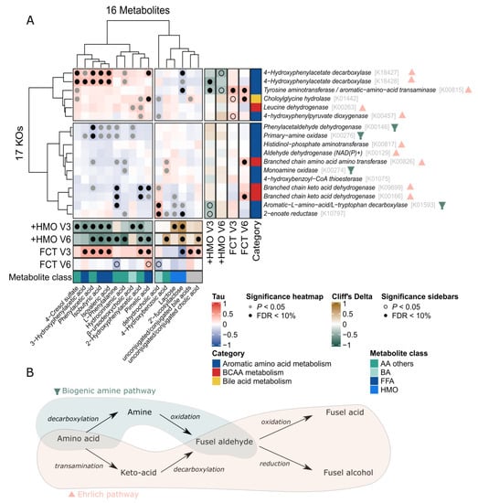 Several statistically significant positive associations were found between a cluster of metabolites, including fusel acids, 4-cresol sulfate, phenylalanine, hydrocinnamic acid and pimelic acid, and KO involved in the Ehrlich pathways (Figure 6B). Furthermore, several of these metabolites and KO were positively associated with later FCT at V3 and were lower in infants fed with HMO-supplemented EHF. On the other hand, the same cluster of metabolites was negatively associated with other KO from the amino acid metabolism, including some KO involved in the amine pathways. These results suggest that the microbiome contributes to the production and excretion of these amino acid metabolites via the Ehrlich pathway rather than the biogenic amine pathway. Modulation of the microbiome composition and metabolism by HMO may lead to a downregulation of the Ehrlich pathway and amino-acid metabolites.