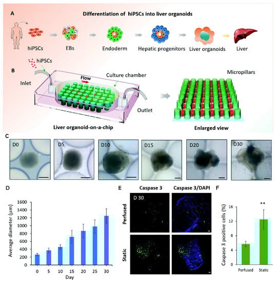 - Wang, Y.; Wang, H.; Deng, P.; Chen, W.; Guo, Y.; Tao, T.; Qin, J. In Situ Differentiation and Generation of Functional Liver Organoids from Human IPSCs in a 3D Perfusable Chip System. Lab Chip 2018, 18, 3606–3616. [Google Scholar] [CrossRef] [PubMed]