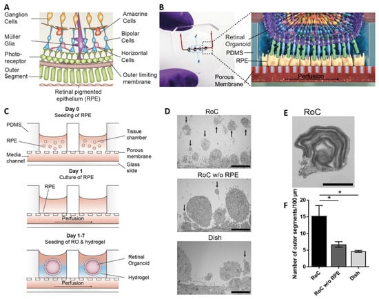 - Achberger, K.; Probst, C.; Haderspeck, J.C.; Bolz, S.; Rogal, J.; Chuchuy, J.; Nikolova, M.; Cora, V.; Antkowiak, L.; Haq, W.; et al. Merging Organoid and Organ-on-a-Chip Technology to Generate Complex Multi-Layer Tissue Models in a Human Retina-on-a-Chip Platform. eLife 2019, 8, e46188. [Google Scholar] [CrossRef] [PubMed]