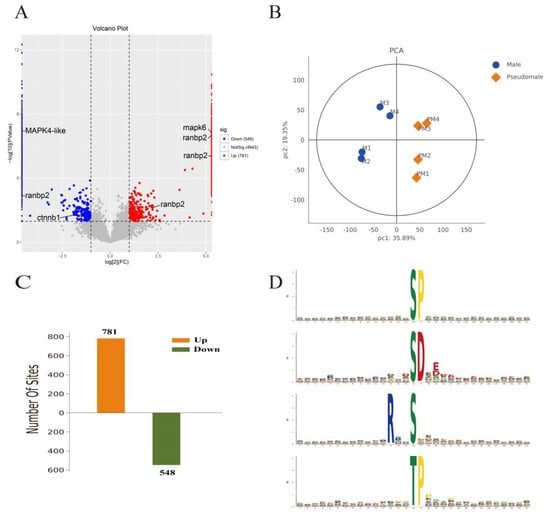 In total, 1329 differentially phosphorylated sites were identified (pseudomale versus male, with a cutoff consisting of a 2-fold change with a p-value < 0.05) that corresponded to 1045 proteins. Among these proteins, the phosphorylation of 781 sites was upregulated and the phosphorylation of 548 sites was downregulated (Figure 3; Supplementary Table S1 (Sheet 4)).