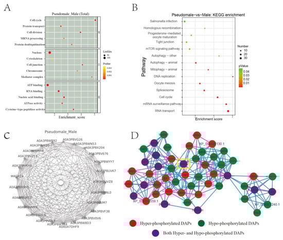 A PPI network was assembled in order to investigate differences in the biological function of DPPs between pseudomale and male testes. As shown in Figure 4C and Table 1, based on the connection density in the PPI, the top five most enriched DPPs were cell division cycle 5-like protein, a nonspecific serine/threonine protein kinase, cyclin-G-associated kinase-like, tyrosine 3-monooxygenase/tryptophan 5-monooxygenase activation protein epsilon, and E3 SUMO-protein ligase Ran-binding protein (RanBP2). Interestingly, four differentially phosphorylated sites were identified in RanBP2: Ser410, Thr922, Ser2331 hyperphosphorylated, and Ser1128 hypophosphorylated (as determined by comparing pseudomale and male testes). Based on this observation, a PPI network centered on RanBP2 was constructed. Among the interaction partners, several categories were identified, such as cell division cycle protein (Cdc5l and Cdc40), minichromosome maintenance complex component (Mcm3, Mcm4, and Mcm7), small ubiquitin-like modifier (Sumo1, Sumo2), and eukaryotic translation initiation factor (Eif2s3, Eif3a, and Eif4e3).
