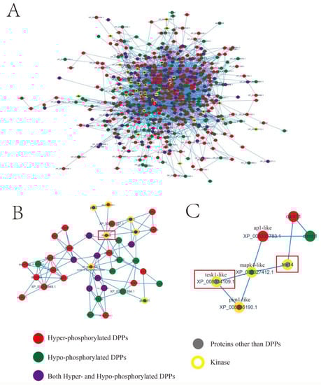 A kinase-associated network was constructed by labeling the kinases in the DPPs and four additional testis-expressed kinases (Tesk1, Tesk1-like, Tesk2, and Tex14), three of which were in the network (Tesk1, Tesk1-like, and Tex14; see Figure 5A and Supplementary Table S2). Eighteen clusters were generated, and two of these clusters were selected for further analysis. As shown in Figure 5B, the center of one cluster was mitogen-activated protein kinase 6 (Mapk6), which interacts with several cyclin-dependent kinases (Cdk12, Cdk13, and cyclin-G-associated kinase-like; XP_008334590.1). The other cluster, “Tesk1l/Pim1l-Mapk4l-Tex14 kinase cascade”, was relatively simple and consisted of seven molecules (Figure 5C), four of which were kinases, including two testis-expressed kinases and three other proteins: caspase recruitment domain-containing protein 11 (Card11), transcription factor Ap1-like (Ap1-like), and β-catenin (Ctnnb).