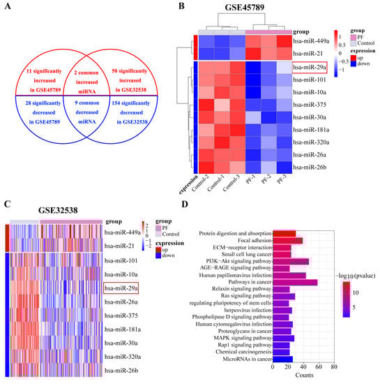 miR-29a expression is significantly downregulated in fibrotic lung tissue, as demonstrated by bioinformatics analysis. (A) Venn diagram showing the highly expressed, lowly expressed, and overlapping miRNAs in GSE45789 and GSE32538. (B,C) Expression of different miRNAs is represented by heat maps and sample clustering; Red boxes indicate decreased miR-29a. (D) KEGG pathway enrichment of the predicted target genes of miR-29a-3p.