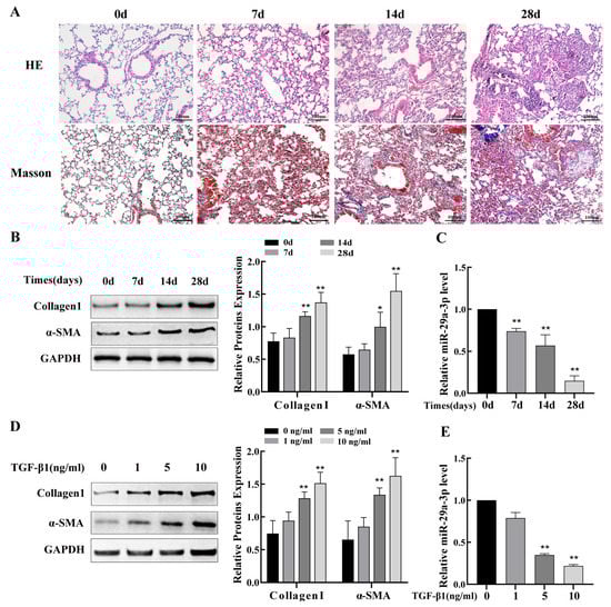 miR-29a-3p expression was downregulated both in vitro and in vivo in the silica-induced pulmonary fibrosis model. (A) Histological changes and collagen deposition in the lung tissues of silicosis model mice were observed upon hematoxylin and eosin (HE) and Masson staining. (B) The expression of α-SMA and collagen I in the lung tissues of mice administered 50 mg/kg silica for 7, 14, and 28 days measured using Western blot compared with that in the control group. (C) miR-29a-3p levels were measured using qRT-PCR in the lung tissues of mice administered silica. (D) Western blot analysis of collagen I and α-SMA levels in TC-1 cells treated with various concentrations of TGF-β1. (E) miR-29a-3p levels in TC-1 cells treated with various concentrations of TGF-β1, as determined via qRT-PCR. Data are presented as the mean ± SD from at least three independent experiments. * indicates p < 0.05 vs. the control group, and ** indicates p < 0.01 vs. the control group.