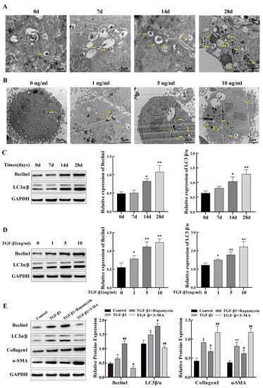 Autophagy regulates silica-induced pulmonary fibrosis. (A,B) Representative electron microscopy images from mouse lung tissues exposed to 50 mg/kg silica for 0, 7, 14, and 28 days and TC-1 cells treated with different concentrations (0, 1, 5, and 10 ng/mL) of TGF-β1 for 48 h; yellow arrows indicate autophagosomes. (C) Western blot analysis of proteins associated with autophagy Beclin1 and LC3-α/β level in mouse lung tissues exposed to silica. (D) Western blot analysis of proteins associated with autophagy Beclin1 and LC3-α/β level in TGF-β1-treated TC-1 cells. (E) Western blot results of Beclin1 and LC3α/β as well as fibrosis markers, α-SMA and collagen I, in TC-1 cells treated with autophagy inhibitor (3-MA) and inducer (rapamycin) together with 10 ng/mL TGF-β1. Data are presented as the mean ± SD from at least three independent experiments; * indicates p < 0.05 vs. the control group, ** indicates p < 0.01 vs. the control group, # indicates p < 0.05 vs. the TGF-β1 group, and ## indicates p < 0.01 vs. the TGF-β1 group.