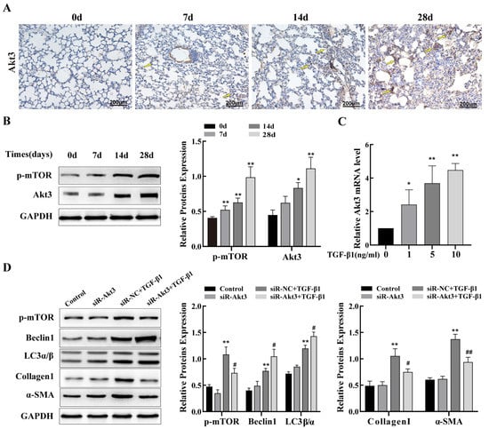 Inhibition of Akt3 expression promotes autophagy in lung epithelial cells and ameliorates fibrosis by activating mTOR. (A) Representative images of Akt3 immunohistochemistry in lung tissue of mice with silicosis; Yellow arrows indicate positive expression of Akt3. (B) Western blot analysis of Akt3 and phospho-mTOR levels in lung tissues of mice with silicosis. (C) qRT-PCR analysis of Akt3 levels from TC-1 cells treated with various doses of TGF-β1. (D) The expression of phospho-mTOR, autophagy-related proteins LC3α/β and Beclin1, and fibrosis markers, α-SMA and collagen I, were verified using Western blot in TC-1 cells transfected with 50 nM of siR-Akt3 or siR-NC before treatment with 10 ng/mL of TGF-β1. Data are presented as the mean ± SD from at least three independent experiments; * indicates p < 0.05 vs. the control group, ** indicates p < 0.01 vs. the control group, # indicates p < 0.05 vs. the siR-NC plus TGF-β1 group, and ## indicates p < 0.01 vs. the siR-NC plus TGF-β1 group.