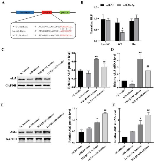 miR-29a-3p targets Akt3 and inhibits its expression. (A) The location of the miR-29a-3p target site in the Akt3 3′ UTR. The red region denotes the binding sequences between miR-29a-3p and the 3′-UTR of Akt3. (B) The interaction of Akt3 and miR-29a-3p in TC-1 cells was validated using a dual-luciferase reporter assay. The intensity of luciferase activity is expressed as the ratio of firefly/Renilla activity. (C,D) Western blot and qPCR results of Akt3 levels in TC-1 cells transfected with miR-29a-3p mimics before treatment with 10 ng/mL TGF-β1. (E,F) Western blot and qPCR results of Akt3 levels in TC-1 cells transfected with miR-29a-3p inhibitor before treatment with 10 ng/mL TGF-β1. Data are presented as the mean ± SD from at least three independent experiments; * indicates p < 0.05 vs. the control group, ** indicates p < 0.01 vs. the control group, ## indicates p < 0.01 vs. the TGF-β1 plus NC mimics/inhibitor group.