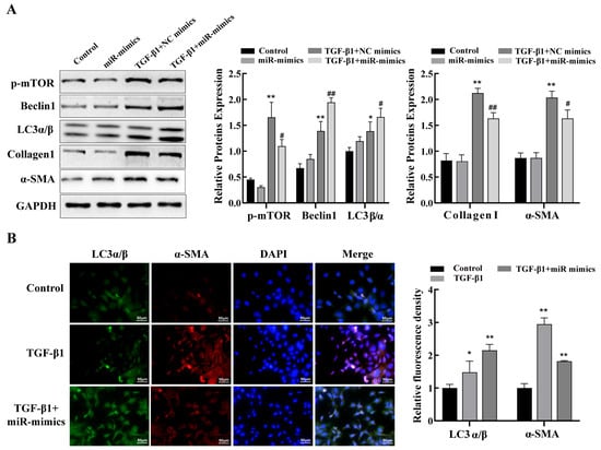 TC-1 cells transfected with miR-29a-3p were treated with 10 ng/mL of TFG-β1 for 24 h and then fixed with 4% paraformaldehyde for 30 min, washed 3 times with PBS, and serum blocked for 10 min. Then the cell was incubated overnight at 4 °C with the following specific primary antibody: anti-alpha-SMA (1:100; Affinity, Cincinnati, OH, USA), anti-LC3α/β pAb (1:100; MBL, Nagoya, Japan), washed 3 times with PBS and then incubated with fluorescence secondary antibodies corresponding to the host species of the primary antibodies donkey anti-rabbit IgG (Invitrogen, Waltham, MA, USA) or goat anti-mouse IgG (ABclonal, Wuhan, China) at a dilution ratio of 1:100 for 1.5 h at 37 °C. DAPI (Abcam, Boston, MA, USA) was used to stain the nuclei, then examined using a fluorescence microscope (Olympus Optical Co., Ltd., Tokyo, Japan), and images were captured.